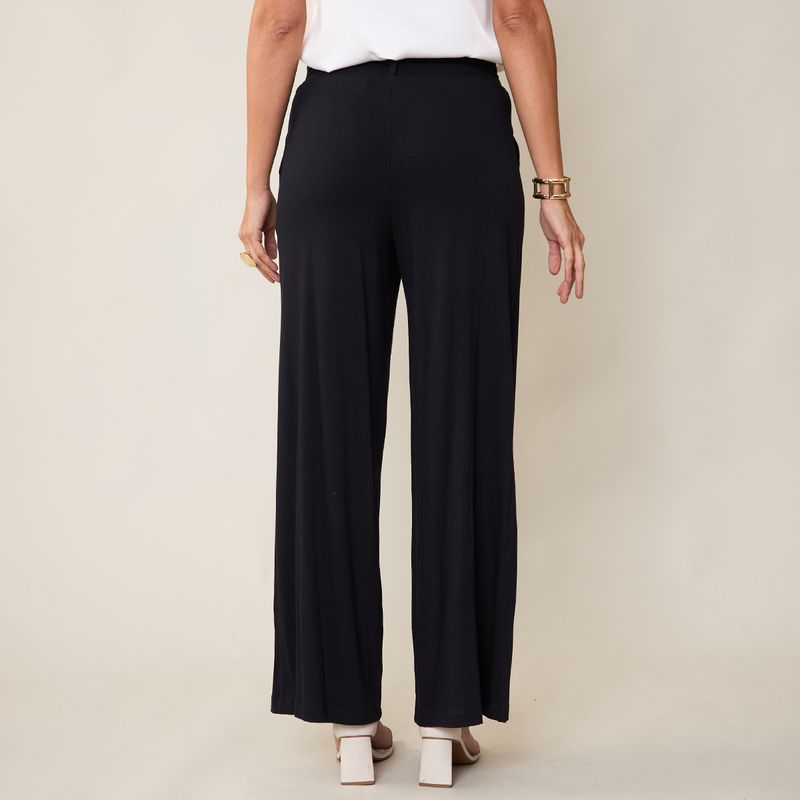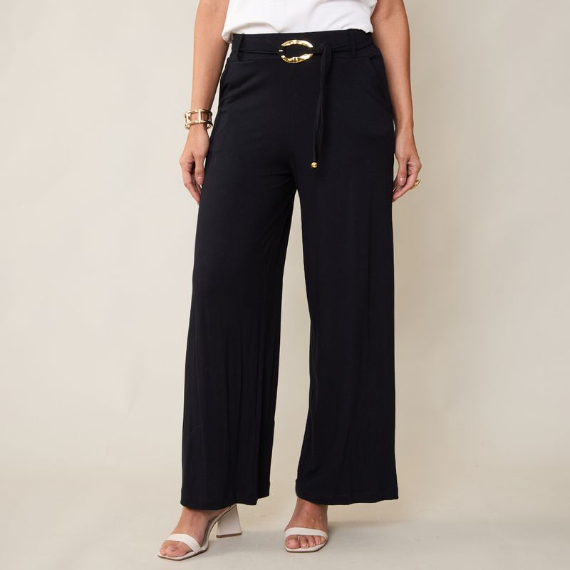 Calça pantalona feminina preta com modelagem ampla e caimento leve. Ideal para compor looks elegantes no dia a dia, oferecendo conforto e versatilidade tanto para trabalho quanto para momentos casuais.