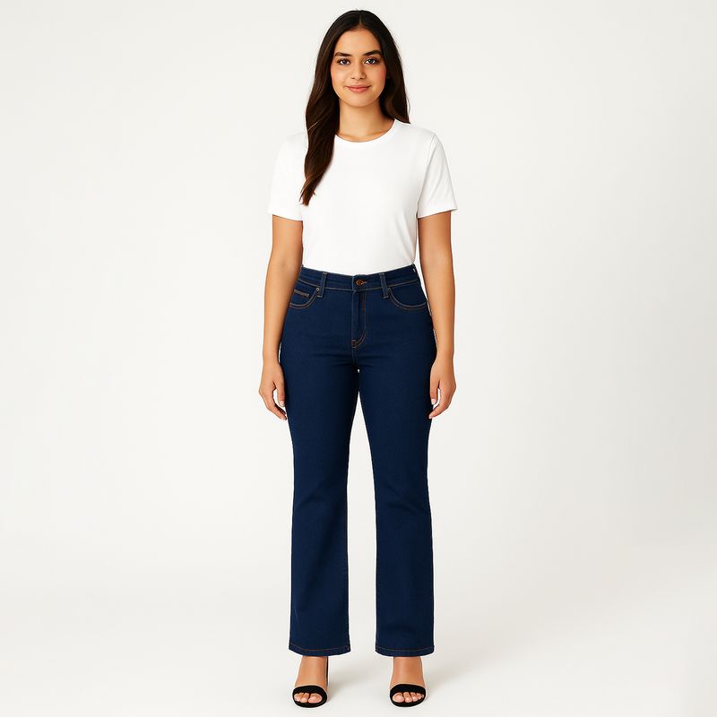A calça jeans feminina flare azul escuro da Sawary valoriza a silhueta com cintura alta e barra levemente aberta. Versátil e atemporal, é perfeita para compor looks casuais arrumados, do trabalho aos compromissos à noite, sempre com muito conforto.