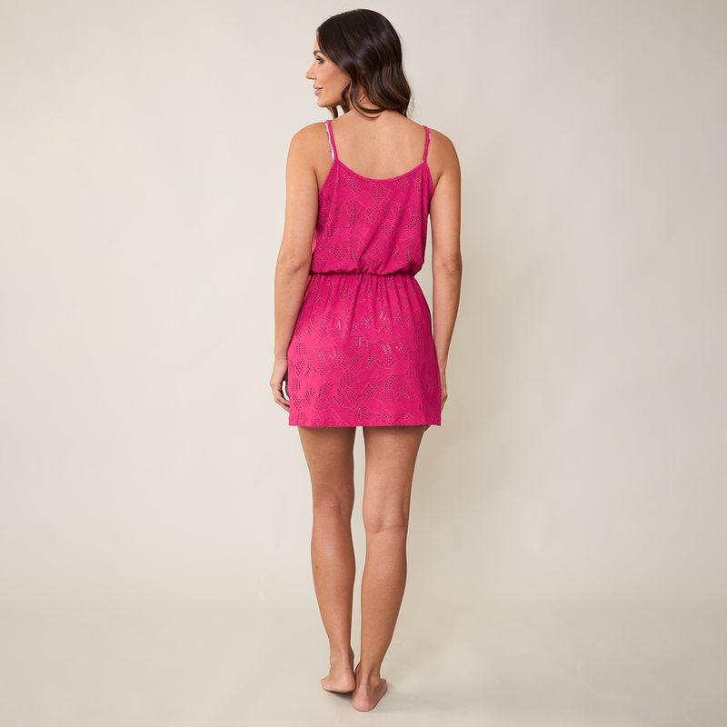 Saída de Praia Chemise feminina curta em renda pink, com decote transpassado e caimento leve. Ideal para momentos de descanso, proporcionando frescor, conforto e um visual delicado e moderno.