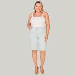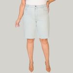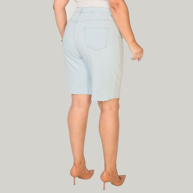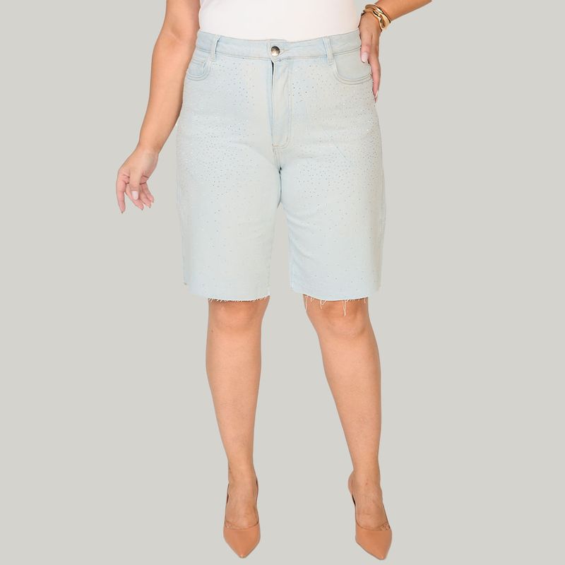 Bermuda plus size feminina, confeccionada em jeans de alta qualidade, com detalhes brilhantes e acabamento desfiado na barra. Modelagem confortável e ajuste perfeito ao corpo, ideal para compor looks casuais e sofisticados.