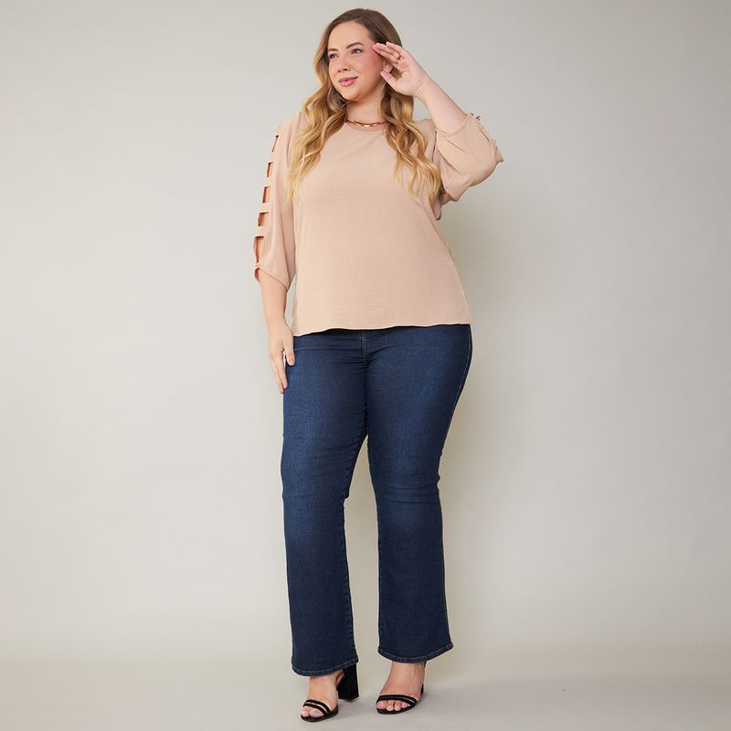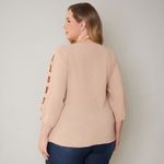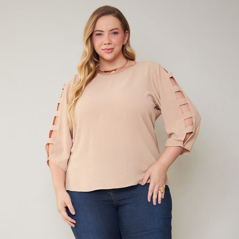 Blusa plus size manga 3/4 com detalhe vazado e botões decorativos nos braços. Em tons vermelho vibrante e bege, com modelagem soltinha, é perfeita para compor looks elegantes com conforto e estilo.