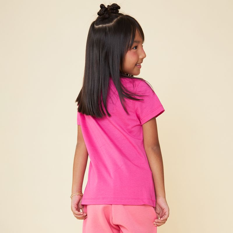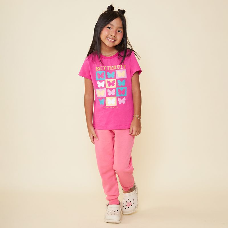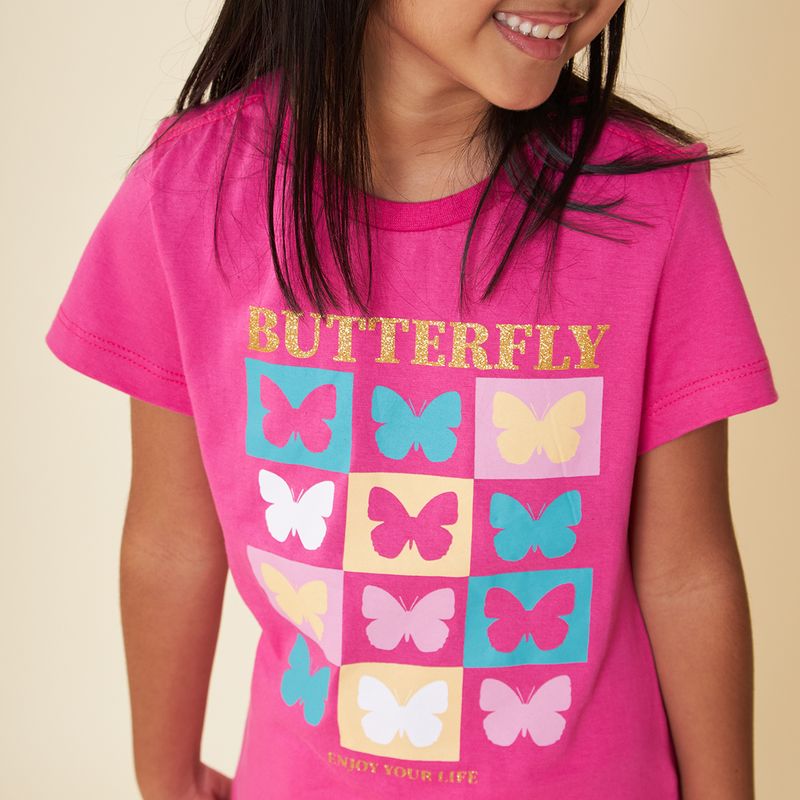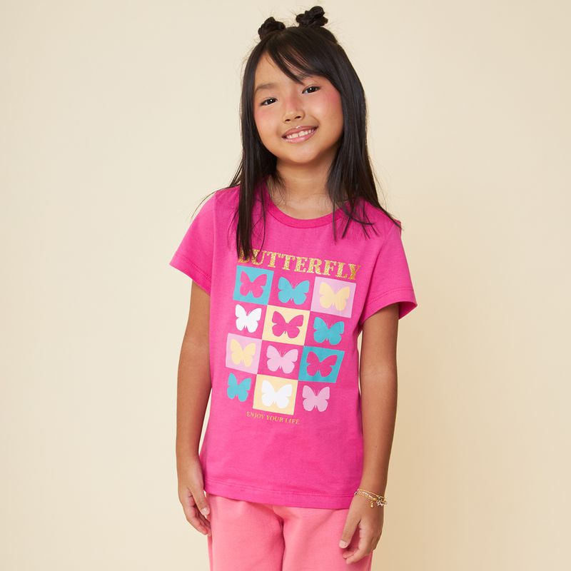 Blusa infantil em malha rosa vibrante com estampa de borboletas coloridas e detalhes em glitter, trazendo alegria e estilo para o look das meninas.