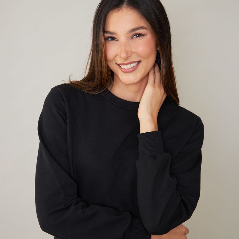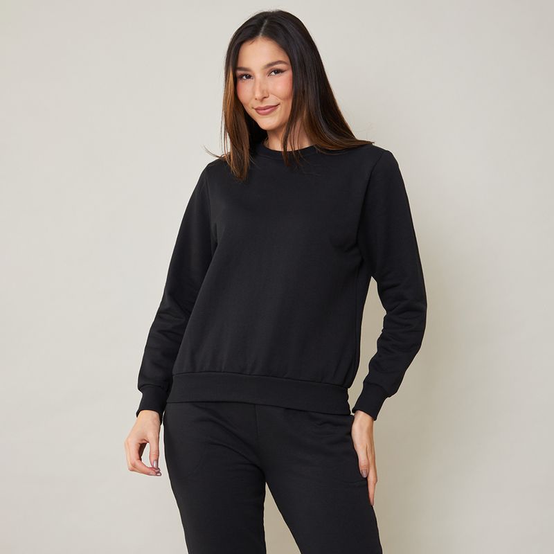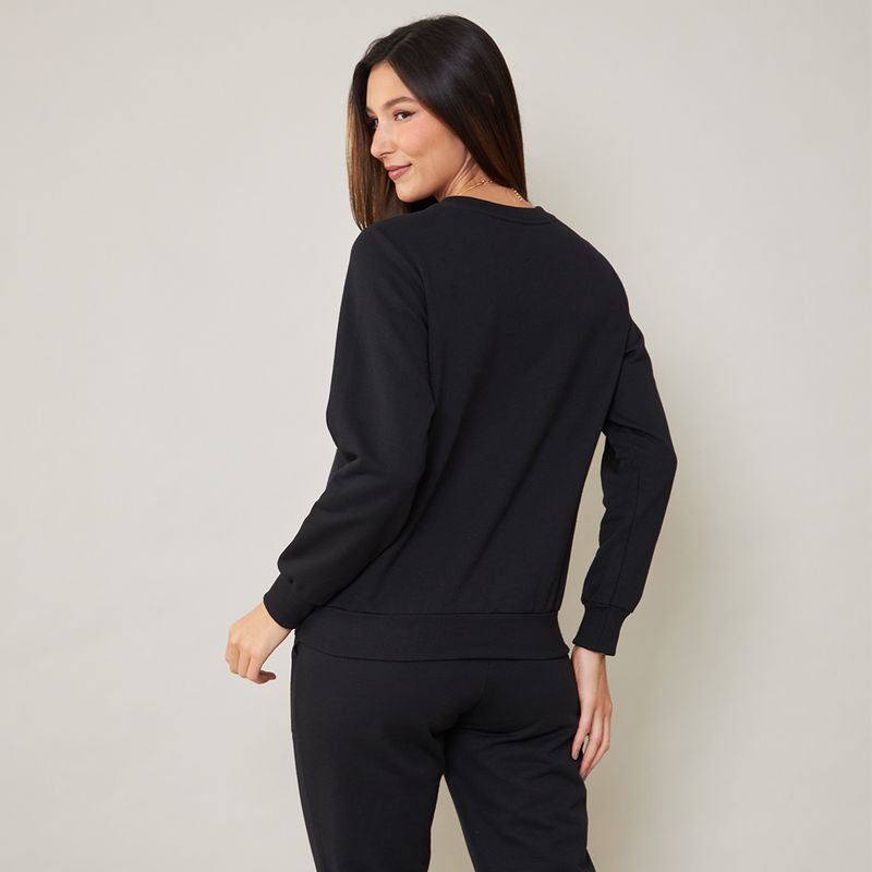 Blusa feminina básica em moletom preto. Modelo com gola careca, mangas longas e barra ajustada com acabamento em ribana, proporcionando ajuste confortável ao corpo. Peça versátil e atemporal, ideal para os dias mais frescos e para compor looks casuais ou esportivos. Confortável e com ótimo caimento, é perfeita para o dia a dia ou para momentos de relaxamento com estilo.