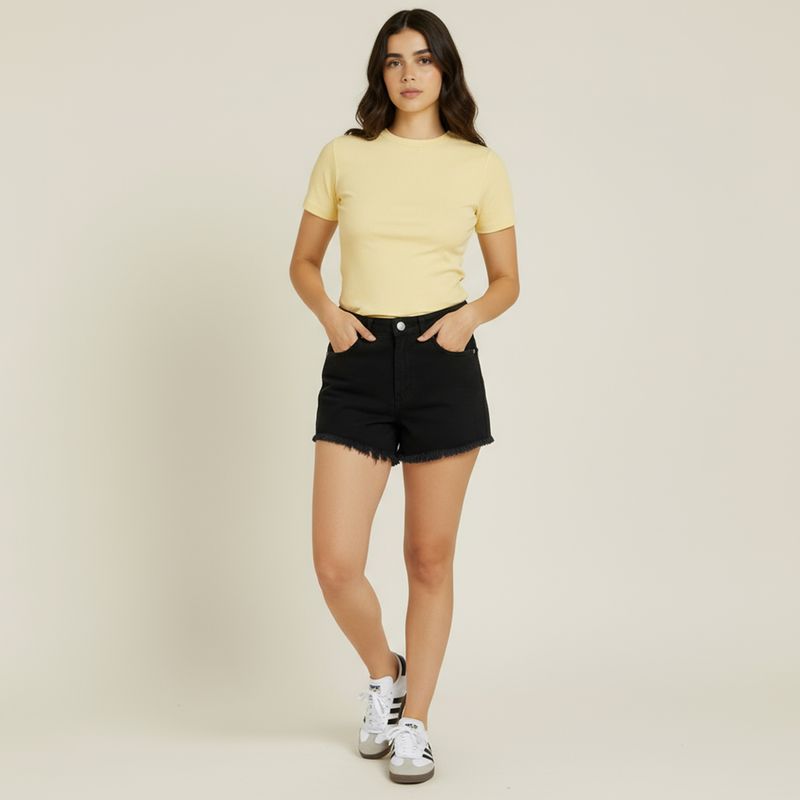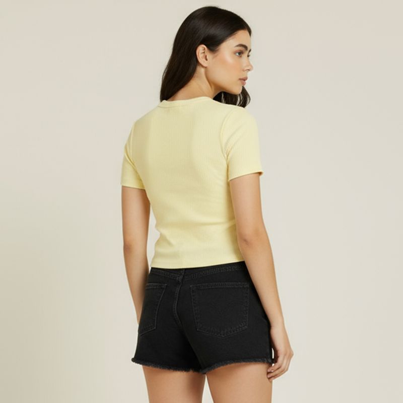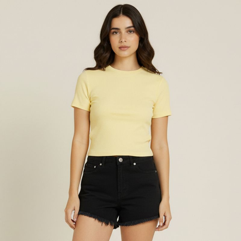 A blusa feminina amarela canelada manga curta combina conforto e estilo em uma peça moderna e versátil. Com toque macio e modelagem ajustada, valoriza o corpo com leveza, sendo ideal para compor looks casuais e descomplicados no dia a dia.