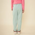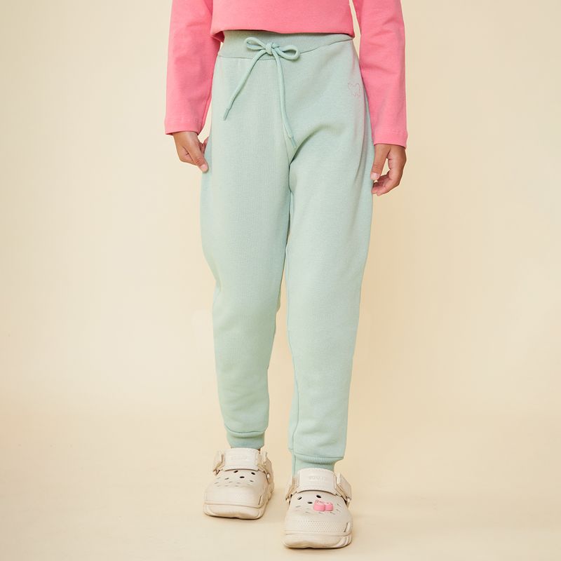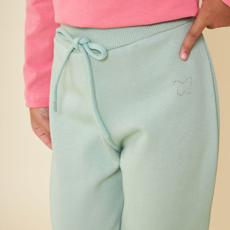 A calça verde é confeccionada em algodão. A peça de moletom possui modelagem jogger, caimento justo, barra canelada, bolsos frontais, termocolante de strass em formato de borboleta, cós canelado com elástico e fechamento por cordão.