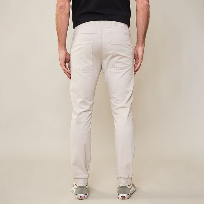 Calça jogger masculina em sarja na cor areia, ideal para quem busca estilo e conforto no dia a dia. Possui cós com elástico e cordão ajustável, modelagem jogger com barra levemente ajustada e bolsos funcionais. Versátil e moderna, combina facilmente com camisetas, polos e camisas, sendo perfeita tanto para produções casuais quanto para momentos mais arrumados.