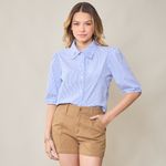 é uma peça clássica repaginada com detalhes delicados. Confeccionada em tecido leve e confortável, possui listras verticais que alongam a silhueta, gola tradicional com bordado floral e fechamento por botões frontais. A manga bufante com leve franzido traz um toque romântico e moderno, tornando a camisa ideal para composições casuais ou sofisticadas.