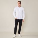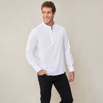 Camisa masculina em algodão com manga longa e gola padre. O modelo possui abertura frontal parcial com botões e punhos ajustáveis, garantindo um visual moderno e sofisticado. O tecido leve e respirável proporciona conforto e elegância, sendo ideal para compor looks casuais refinados ou produções mais formais em ocasiões especiais. Uma peça versátil e atemporal no guarda-roupa masculino.