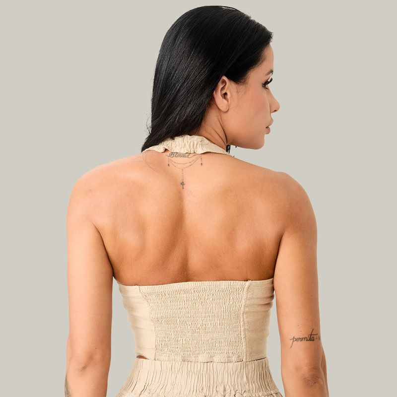 Colete feminino de linho off-white, modelo cropped com fechamento frontal por botões, frente única, lastex nas costas. Peça sofisticada e versátil, ideal para compor looks modernos e elegantes. Combine com calça de alfaiataria para um visual chic ou com jeans para um toque casual e estiloso.