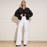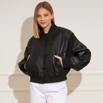 A jaqueta é confeccionada em PU. A peça possui modelagem bomber, caimento amplo, mangas longas com punho canelado, barras caneladas, recorte canelado nas cavas, fechamento frontal por botões de pressão e gola canelada.