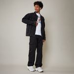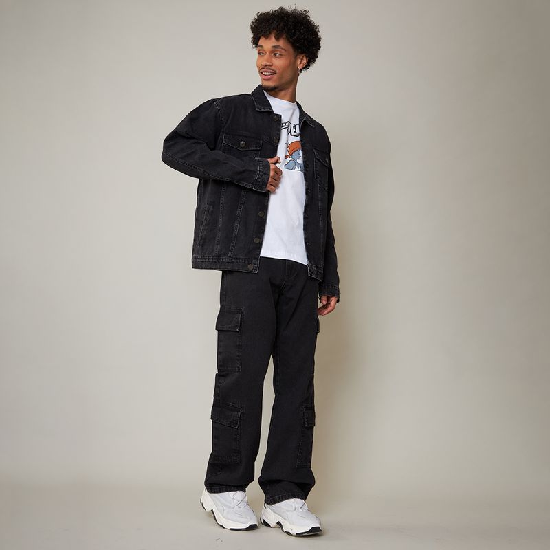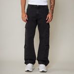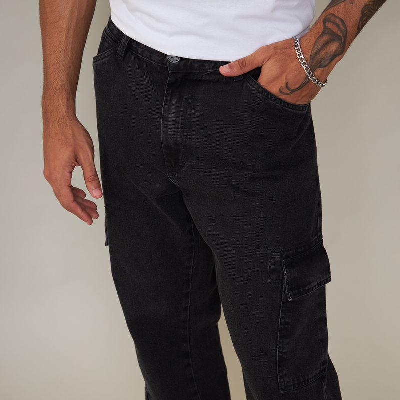 Calça jeans masculina cargo na cor preta, com bolsos utilitários laterais e modelagem reta. Confortável e cheia de estilo, é ideal para compor looks urbanos e despojados, garantindo praticidade no dia a dia.
