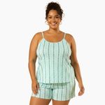 Pijama feminino plus size com regata e short estampado de corações. Confortável, leve e pensado para oferecer liberdade de movimentos, ideal para noites de descanso com muito frescor.