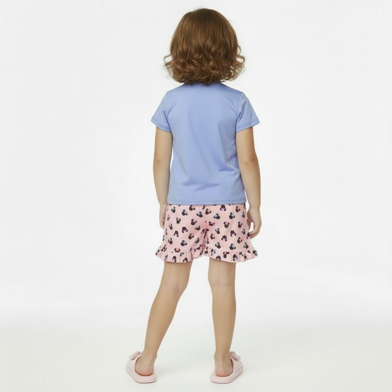 Conjunto infantil feminino Disney Minnie composto por camiseta lilás com estampa da personagem e shorts rosa com babadinhos e estampa repetida da Minnie. Feito em malha leve e macia, o modelo proporciona conforto e liberdade para brincar. Perfeito para o dia a dia, une o charme da personagem mais querida da Disney com o toque divertido que as pequenas adoram.