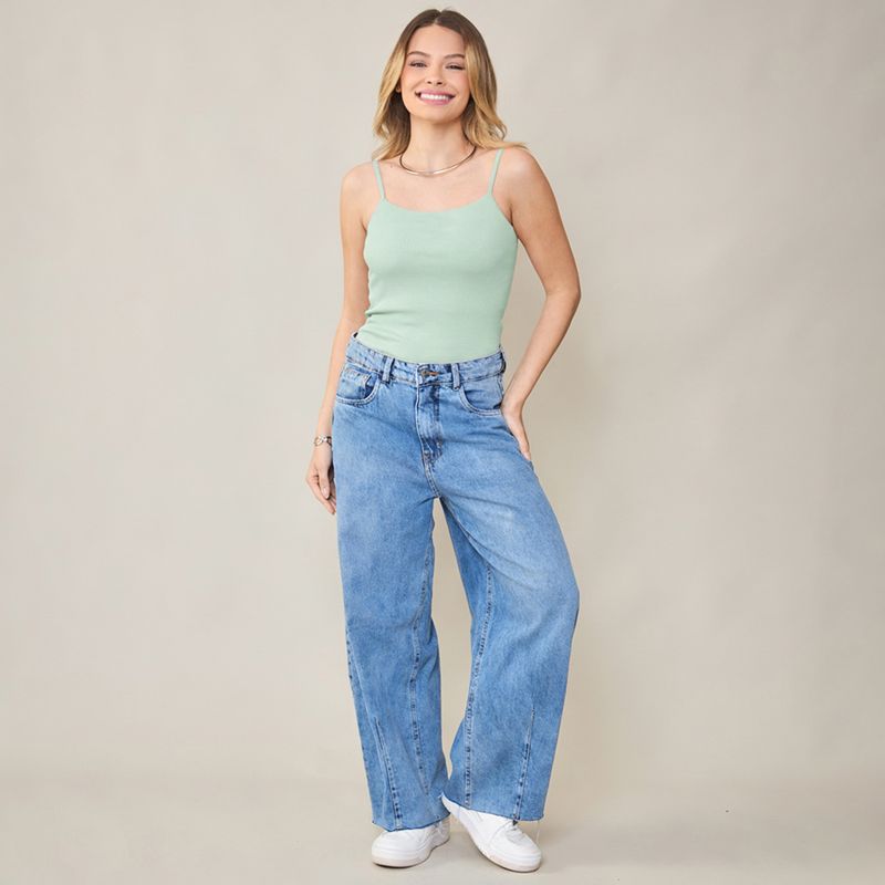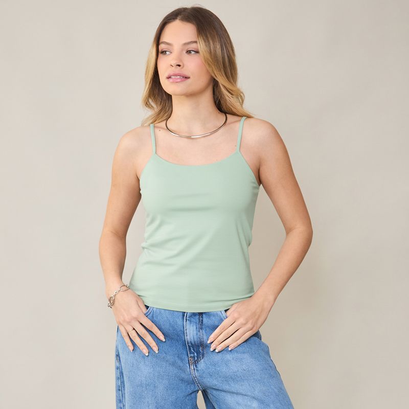 A regata verde com alças finas é uma peça leve e versátil, ideal para dias quentes. Com modelagem ajustada e toque macio, combina facilmente com looks casuais, proporcionando conforto e estilo para o dia a dia.