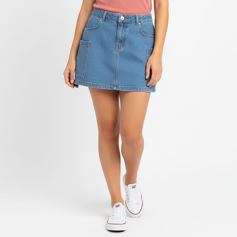 Saia jeans curta feminina com bolsos frontais utilitários, modelagem confortável e visual moderno. Ideal para compor looks casuais no dia a dia, combinando praticidade e estilo com facilidade.