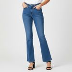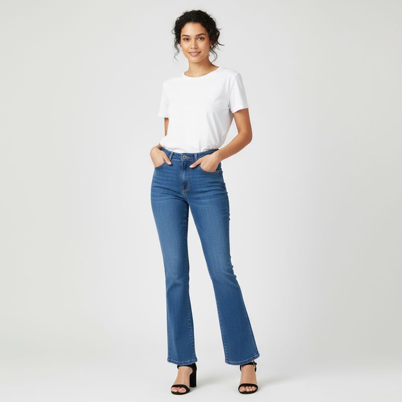 A calça jeans flare feminina Sawary em azul médio combina elegância e conforto, com cintura alta e barra levemente ampliada que alonga a silhueta. Ideal para looks casuais arrumados, ela transita do dia ao noite com facilidade, entregando estilo atemporal.