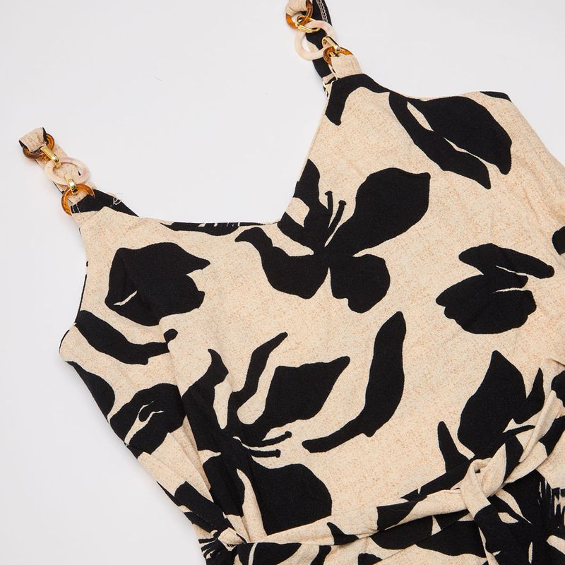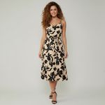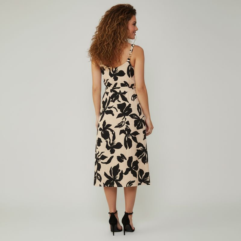 Vestido midi com estampa elegante e alças finas, trazendo leveza e caimento fluido. Acompanha faixa para amarração, valorizando a silhueta. Ideal para compromissos casuais, encontros e dias mais quentes.