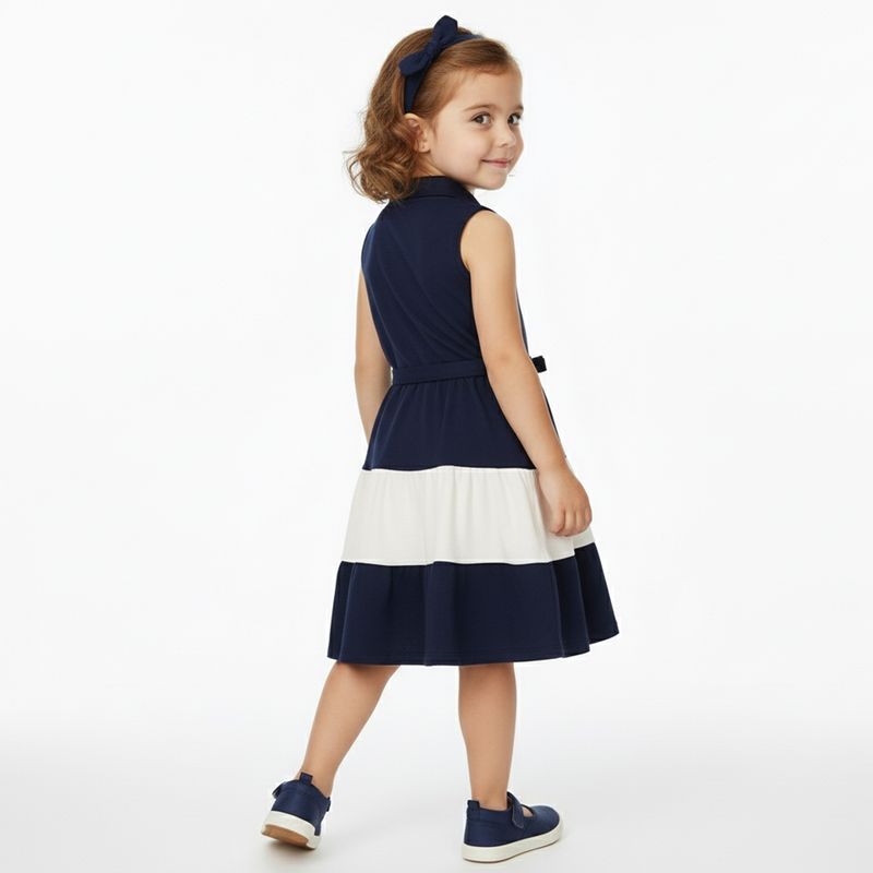 O Vestido Infantil com gola estilo polo é uma peça encantadora que une conforto e elegância em um só look.Com modelagem evasê, gola polo e detalhe de cinto na cintura, o vestido traz um toque clássico e moderno ao mesmo tempo. As faixas em off white garantem contraste suave e sofisticado, ideal para diversas ocasiões — desde passeios até eventos especiais. Confeccionado em malha macia e leve, oferece conforto e liberdade de movimentos para as pequenas.