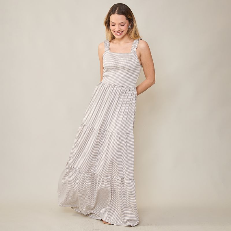 Vestido longo feminino confeccionado em tecido leve e confortável, perfeito para os dias mais quentes. Possui modelagem ampla que valoriza o corpo sem marcar, alças com detalhe franzido e decote quadrado que traz sofisticação ao visual. Estampa em xadrez vicky delicado, garantindo um ar fresco e elegante. Ideal para compor produções casuais ou mais arrumadas, combinando tanto com sandálias quanto com acessórios mais elaborados.